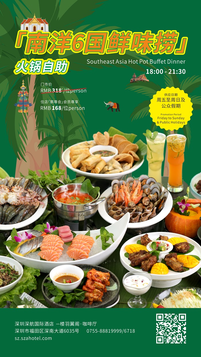 当热带的风掠过芭蕉叶,舌尖总在期待一场鲜活的风味奔赴。东南亚菜的灵魂,全在一场惊艳的味觉交织里。越南香茅猪排骨、泰国青柠辣椒汁蒸鱿鱼、柠檬香茅烤鸡翅、越南金不换炒牛肉、泰式膏酱爆小龙虾、泰式腰果炒鸡。更有无限量的三文鱼、金枪鱼,希鲮鱼、轮番轰炸您的味蕾。4款火锅汤底涮尽各式海鲜及甄选火锅配料,铁板扒档、精致热菜、各式冷盘、诱人甜品、饮品雪糕、冰镇啤酒等,尽情与家人朋友共享大快朵颐的就餐乐趣。